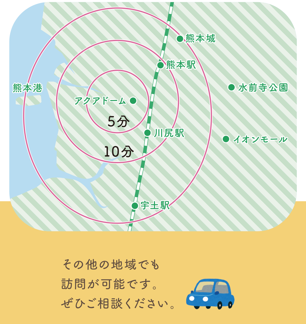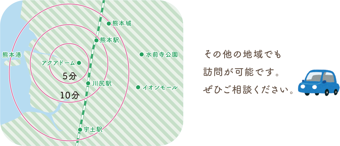 主に熊本市と宇土市です。事業所はアクアドームの近くにあり、そこから到着できる目安時間を地図に記載しています。熊本・宇土市外の場合もまずはお気軽にご相談下さい。