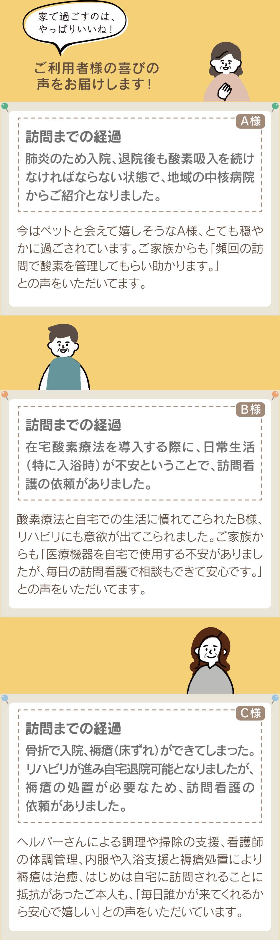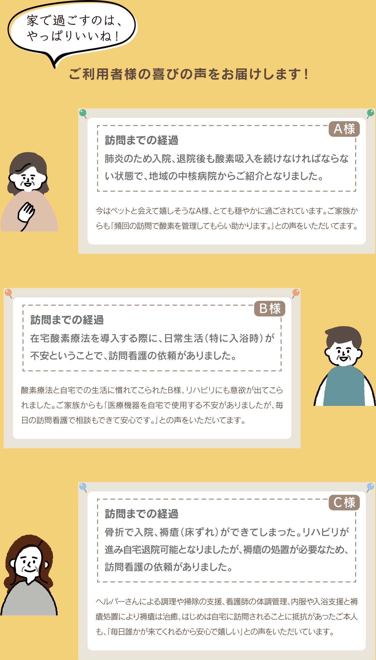 ご利用者、一人一人に合わせた訪問看護とリハビリの提供ができます。 -